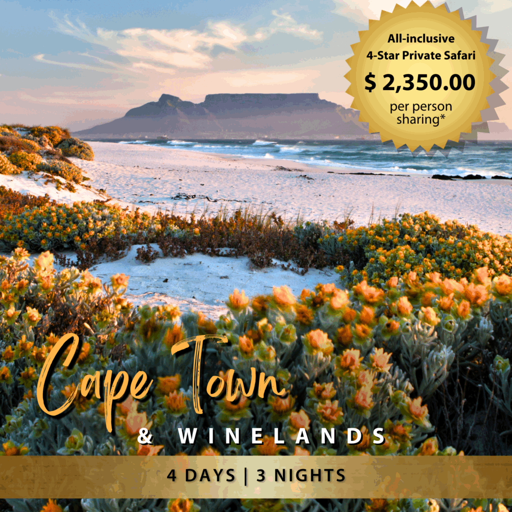 Visit the Mother City, and experience the spectacular scenery, Table Mountain, beaches, culture, and excitement that the city has to offer. Travel through the stunning vineyards and historical Cape Dutch homesteads that adorn the landscapes of the winelands and dramatic mountain backdrops.